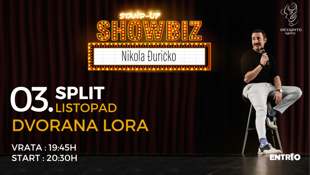 INCOGNITO AGENCY PRESENTS: Nikola Đuričko – showbiz (stand up comedy) Dvorana Lora, Split 03.10.2023. – Utorak Vrata: 19:45h Start : 20:30h Ulaznice možete potažiti na svim ENTRIO prodajnim mjestima te online: https://entr.io/NikolaDurickoST Nakon 4 godine od vrlo uspješnog stand up-a Nikole Đurička ,, Sve što ste htjeli da znate o Đoniju, a niste smijeli nikad da ga pitate” zvijezda serije “Vratit