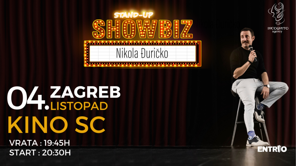INCOGNITO AGENCY PRESENTS: Nikola Đuričko – showbiz (stand up comedy) Kino SC, Zagreb 04.10.2023. – Srijeda Vrata: 19:45h Start : 20:30h Ulaznice možete potažiti na svim ENTRIO prodajnim mjestima te online: https://entr.io/NikolaDurickoZG Nakon 4 godine od vrlo uspješnog stand up-a Nikole Đurička ,, Sve što ste htjeli da znate o Đoniju, a niste smijeli nikad da ga pitate” zvijezda serije “Vratit