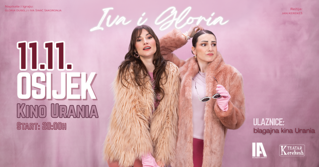 INCOGNITO AGENCY PRESENTS: “IVA I GLORIA” KINO URANIA, OSIJEKUTORAK, 11.11.2025.Vrata: 19:30hStart : 20:00h ULAZNICE: blagajna kina Urania O ČEMU SE RADIIva i Gloria su dvije prijateljice, majke i čistačice koje su nekoliko puta pokušale postat glumice. Rad u kazalištu, pa makar i u obliku čišćenja, otvara im mogućnost da stoje na pozornici, osjete svjetla reflektora i nemilosrdno se suoče sa