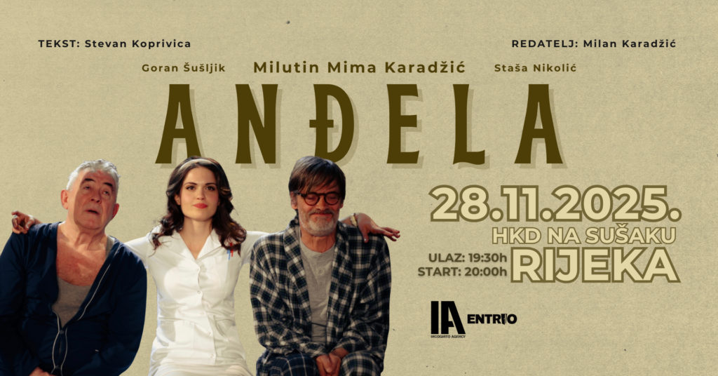 INCOGNITO AGENCY PRESENTS:“ANĐELA”Režija: Milan KaradžićIgraju: Milutin Mima Karadžić, Goran Šušljik i Staša Nikolić HKD NA SUŠAKUPETAK, 28.11.2025. u 20h Ulaznice: https://www.entrio.hr/…/milan-karadzic-predstava… i sva prodajna mjesta Entrija O PREDSTAVI:“Anđela” donosi priču o usamljenosti i prijateljstvu, grubosti i nježnosti i o ljudima koji se u najneočekivanijim okolnostima uče razumijevanju i međusobnom prihvaćanju.Dvojica muškaraca iz različitih svjetova – profesor i vlasnik pečenjare – slučajno dijele