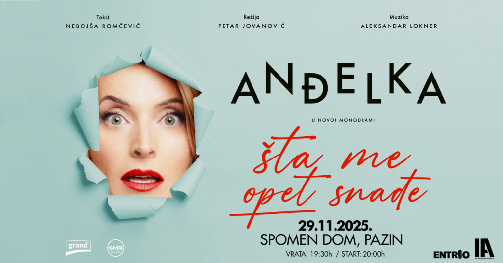 INCOGNITO AGENCY PRESENTS: ANĐELKA – “ŠTA ME OPET SNAĐE” 29.11.2025.SPOMEN DOM PAZIN Ulaz: 19:30hStart: 20:00h Ulaznice: https://bit.ly/Anđelka_Pazin i sva Entrio fizička prodajna mjesta – www.entrio.hr/outlets O predstavi:Anđelka Stević Žugić, jedna je od najomiljenijih glumica regije koju najbolje znamo iz serije “Andrija i Anđelka” te je igrala u izuzetno uspješnim serijskim i filmskim projektima, među kojima su „Ne diraj mi mamu”, “Šetnja s lavom”,