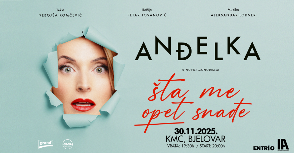 INCOGNITO AGENCY PRESENTS: ANĐELKA – “ŠTA ME OPET SNAĐE” 30.11.2025.KMC, BJELOVAR Ulaz: 19:30hStart: 20:00h Ulaznice: https://bit.ly/Anđelka_Bjelovar i sva Entrio fizička prodajna mjesta – www.entrio.hr/outlets O predstavi:Anđelka Stević Žugić, jedna je od najomiljenijih glumica regije koju najbolje znamo iz serije “Andrija i Anđelka” te je igrala u izuzetno uspješnim serijskim i filmskim projektima, među kojima su „Ne diraj mi mamu”, “Šetnja s lavom”, “Jedini