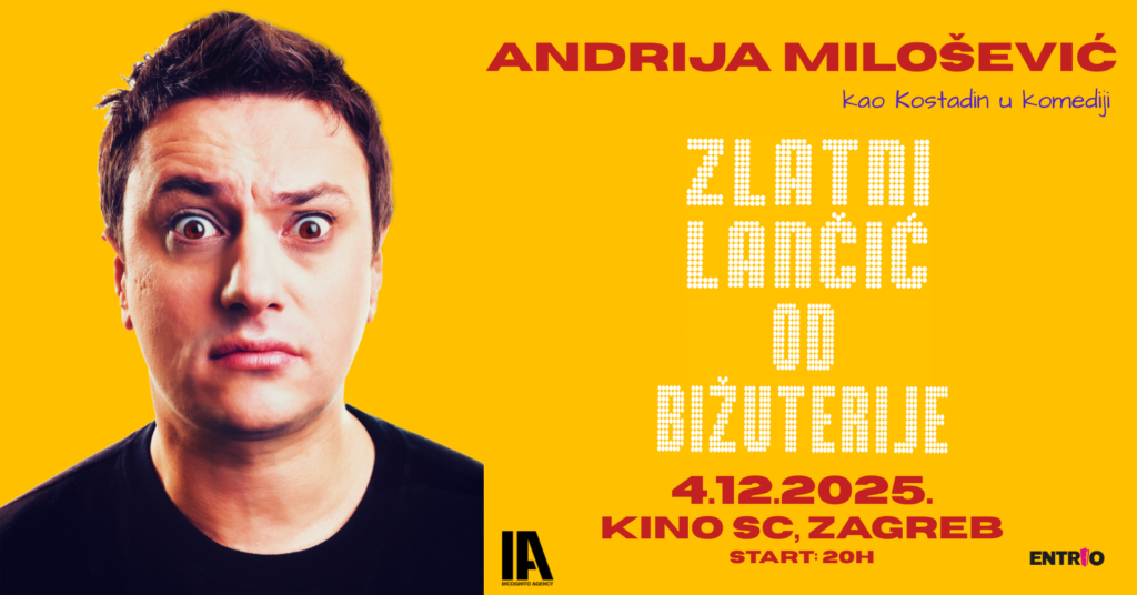 INCOGNITO AGENCY PRESENTS: Andrija Milošević – “Zlatni lančić od bižuterije”ZAGREB, KINO SC4.12.2025. ULAZ: 19:30hSTART: 20:00h ULAZNICE: https://www.entrio.hr/…/zagreb-andrija-milosevic-zlatni… i sva Entrio fizička prodajna mjesta O ČEMU SE RADI?Kostadin – Lale je došao u Beograd pun nade i očekivanja. Ali, kao i svaki čovjek koji je zaljubljen u sebe i lagodniji život, vrlo brzo shvaća da su godine prošle, nije završio školu, ali su