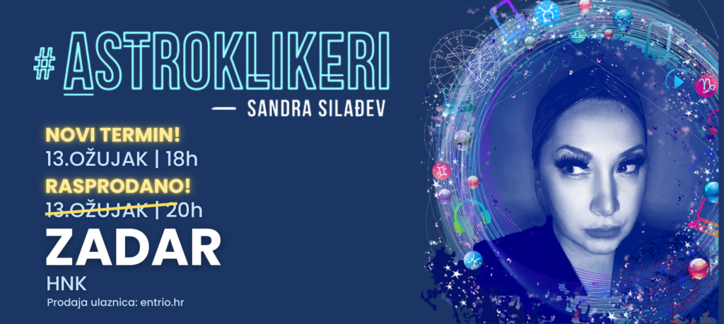 INCOGNITO AGENCY PRESENTS: SANDRA SILAĐEV – “ASTROKLIKERI” HRVATSKO NARODNO KAZALIŠTE, ZADAR RASPRODANO – izvedba 13.3.2026. u 20h DODATNI TERMIN 13.3.2026. u 18h ULAZNICE – novi termin u 18 sati: Entrio – online na: https://www.entrio.hr/event/novi-termin-u-18h-sandra-siladjev-astroklikeri-u-zadru-30490 i na svim Entrio fizičkim prodajnim mjestima (www.entrio.hr/outlets) ULAZ (prvi termin): od 17:30hPOČETAK predstave (prvi termin): 18:00h ULAZ (drugi termin): od 19:30h POČETAK predstave (drugi termin): 20:00h O