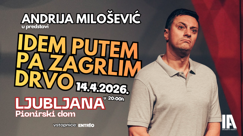 INCOGNITO AGENCY PRESENTS: ANDRIJA MILOŠEVIĆ – “IDEM PUTEM PA ZAGRLIM DRVO” u Ljubljani! UTORAK, 14.4.2026., Pionirski dom Ljubljana ULAZ: 19.30h POČETAK PREDSTAVE: 20.00h ULAZNICE: u prodaji online na: https://www.entrio.si/event/andrija-milosevic-idem-putem-pa-zagrlim-drvo-u-ljubljani-30103 i na svim prodajnim mjestima Entrija u Sloveniji (www.entrio.si/outlets) O ČEMU SE RADI? Nakon rasprodanih izvedbi diljem regije, hit-predstava „Idem putem pa zagrlim drvo“ s Andrijom Miloševićem stiže u Ljubljanu u utorak, 14. travnja! “Idem