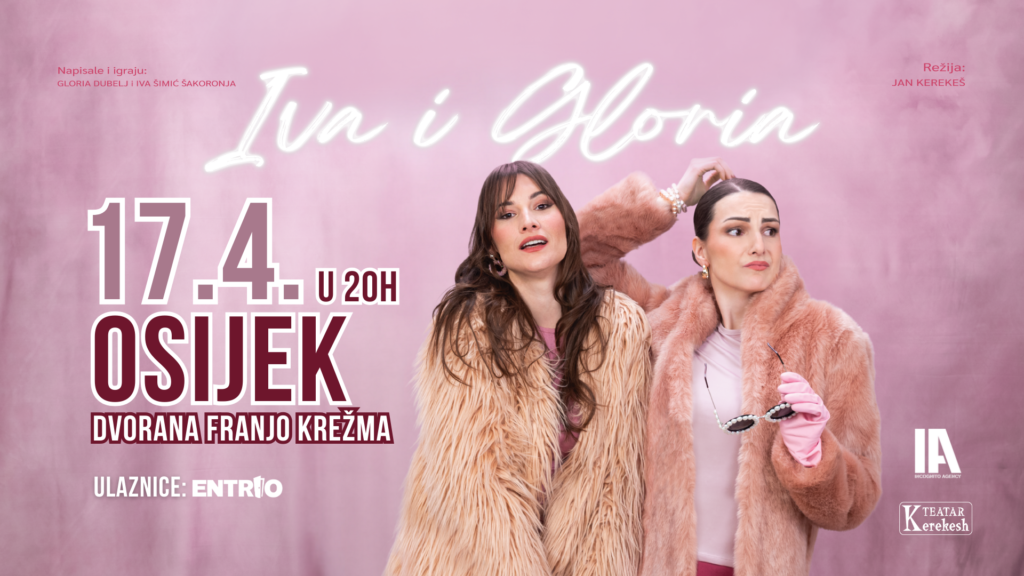 Read MoreINCOGNITO AGENCY PRESENTS:„IVA I GLORIA“PETAK, 17.4.2026.DVORANA FRANJO KREŽMA, OSIJEK ULAZ: 19:30h / POČETAK: 20:00hULAZNICE: https://www.entrio.hr/event/iva-i-gloria-u-osijeku-29510 i na svim prodajnim mjestima Entrija Hit predstava „Iva i Gloria“ koja je osvojila srca publike diljem Hrvatske 17. travnja ponovno dolazi u Osijek! O ČEMU SE RADIIva i Gloria su dvije prijateljice, majke i čistačice koje su nekoliko puta pokušale postat glumice. Rad u kazalištu, pa