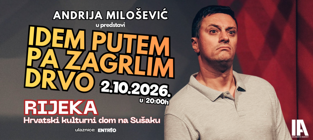INCOGNITO AGENCY PRESENTS: ANDRIJA MILOŠEVIĆ – “IDEM PUTEM PA ZAGRLIM DRVO” ponovno u Rijeci! petak, 2.10.2026., Hrvatski kulturni dom na Sušaku ULAZ – 19:30h POČETAK PREDSTAVE – 20:00h ULAZNICE: online na linku u sustavu Entrio i na svim prodajnim mjestima Entrija u Hrvatskoj (www.entrio.hr/outlets) O ČEMU SE RADI? Nakon rasprodanih izvedbi diljem Hrvatske, hit-predstava „Idem putem pa zagrlim drvo“ s Andrijom Miloševićem vraća se u Rijeku u HKD