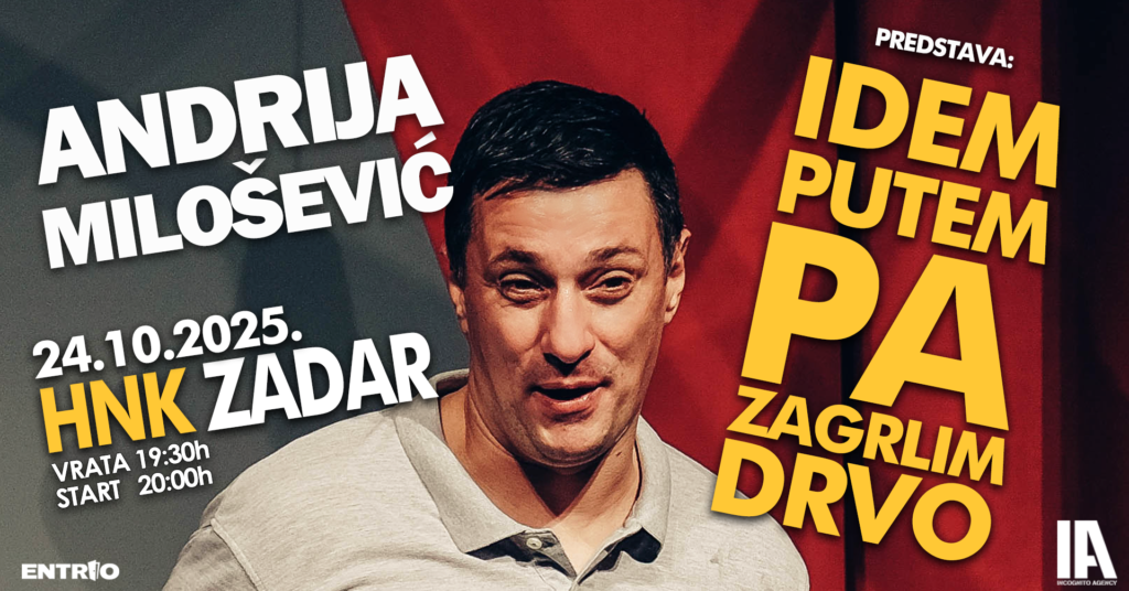 INCOGNITO AGENCY PRESENTS: ANDRIJA MILOŠEVIĆ – “IDEM PUTEM PA ZAGRLIM DRVO” HNK ZADAR24.10.2025.VRATA: 19:30HSTART: 20:00H ULAZNICE: Entrio – https://bit.ly/Andrija_Zadar i sva fizička prodajna mjesta Entrija (www.entrio.hr/outlets):⮕ Petrol Zadar, ul. Ante Starčevića 34⮕ Petrol, ul. Hrvatskog Sabora 6B⮕ Petrol, Gaženička cesta 22A⮕ Music Shop Combo, ul. Vlatka Mačeka 3⮕ Ghetaldus Kaufland, Andrije Hebranga 2⮕ Ghetaldus Supernova, ul. Akcije Maslenica 1⮕ Ghetaldus Kalelarga, Široka