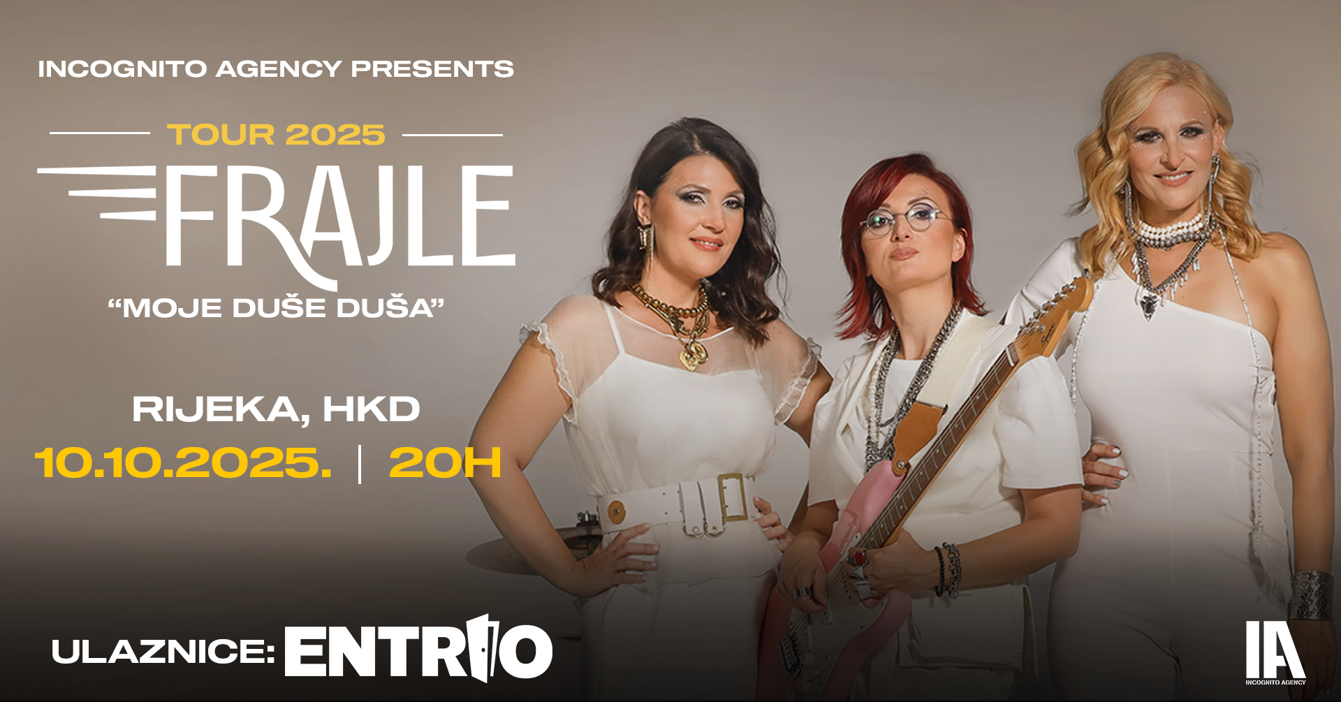 INCOGNITO AGENCY PRESENTS:  Frajle – “Moje duše duša” TOUR 2025 u Rijeci!  10.10.2025. – HKD NA SUŠAKU, RIJEKA One su ambasadorice dobre zabave, šarmatne dame koje osvajaju osmijehom, glasom i beskrajnom energijom! Frajle su poznate po koncertima koji prerastaju u nezaboravna druženja, a sada stižu u Rijeku, da vas 10. listopada 2025. u HKD-u povedu na glazbeno putovanje puno emocija,