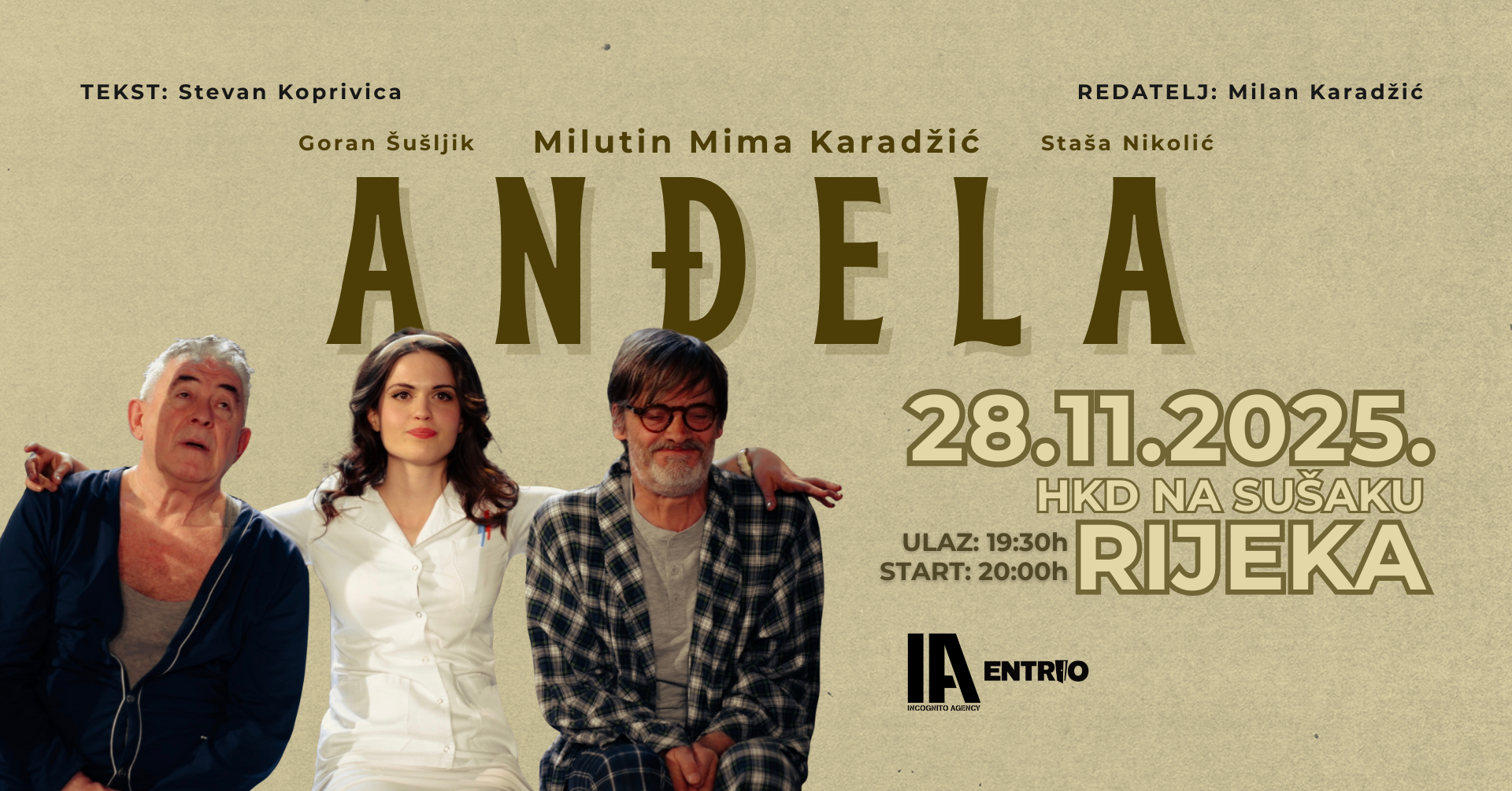 INCOGNITO AGENCY PRESENTS:“ANĐELA”Režija: Milan KaradžićIgraju: Milutin Mima Karadžić, Goran Šušljik i Staša Nikolić HKD NA SUŠAKUPETAK, 28.11.2025. u 20h Ulaznice: https://www.entrio.hr/…/milan-karadzic-predstava… i sva prodajna mjesta Entrija O PREDSTAVI:“Anđela” donosi priču o usamljenosti i prijateljstvu, grubosti i nježnosti i o ljudima koji se u najneočekivanijim okolnostima uče razumijevanju i međusobnom prihvaćanju.Dvojica muškaraca iz različitih svjetova – profesor i vlasnik pečenjare – slučajno dijele